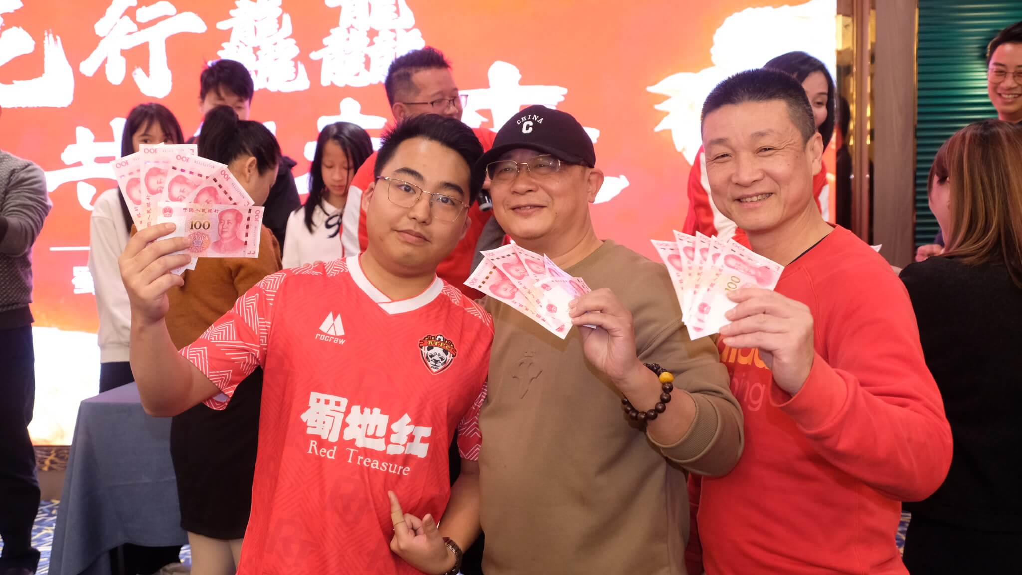 晚宴还设置了惊喜环节。礼品丰厚,奖品诸多,现场还有蜀地红酒业临场加码的现金奖,现场欢声笑语不断,更有嘉宾连续3次中奖,满载而归。