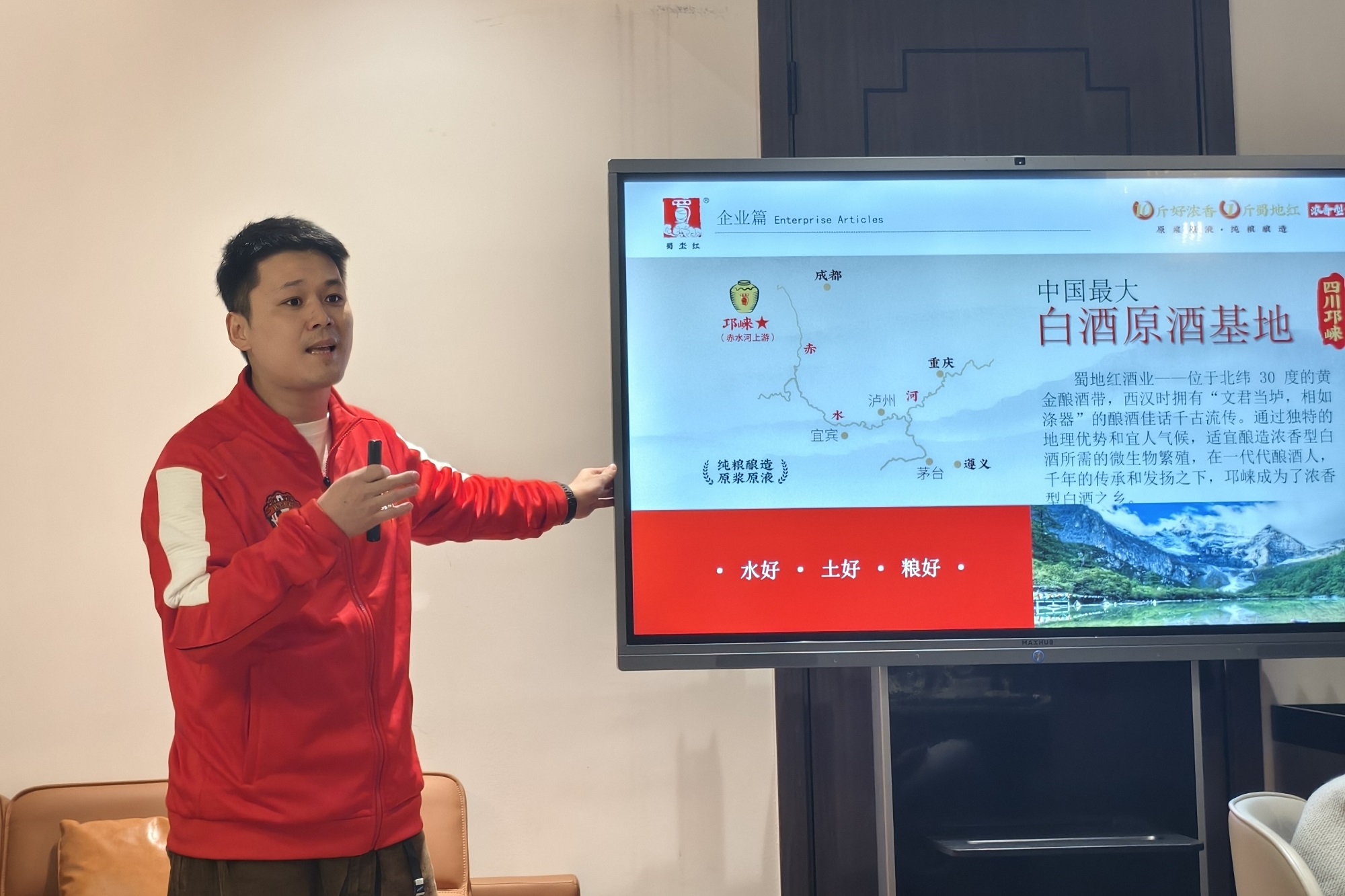 随后,蜀地红酒业销售经理黄剑文先生对蜀地红品牌进行了详细的介绍。他的讲解生动形象,让与会嘉宾对蜀地红的品牌故事、产品特点和市场战略有了更加深入的了解。
