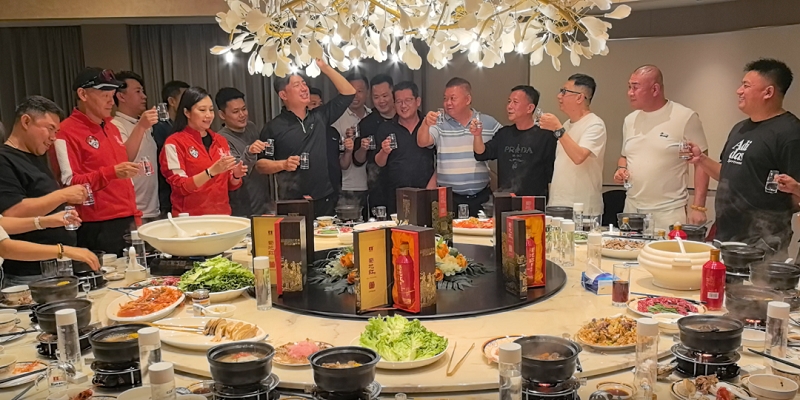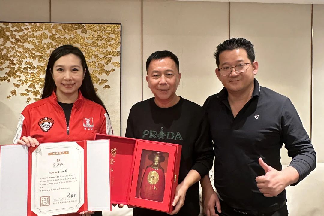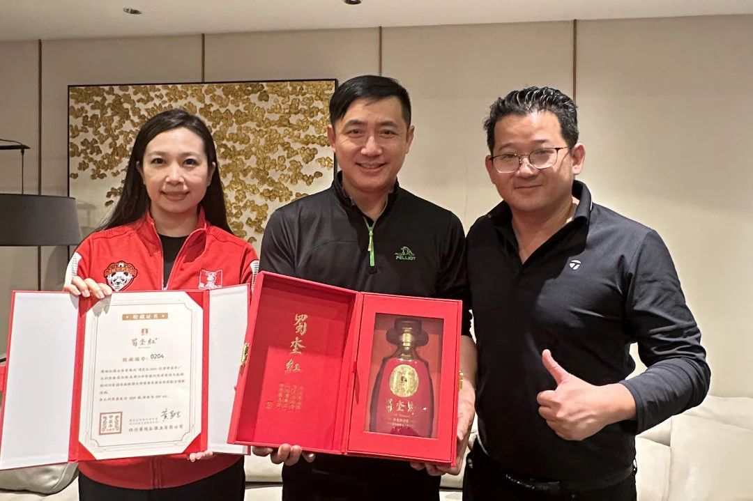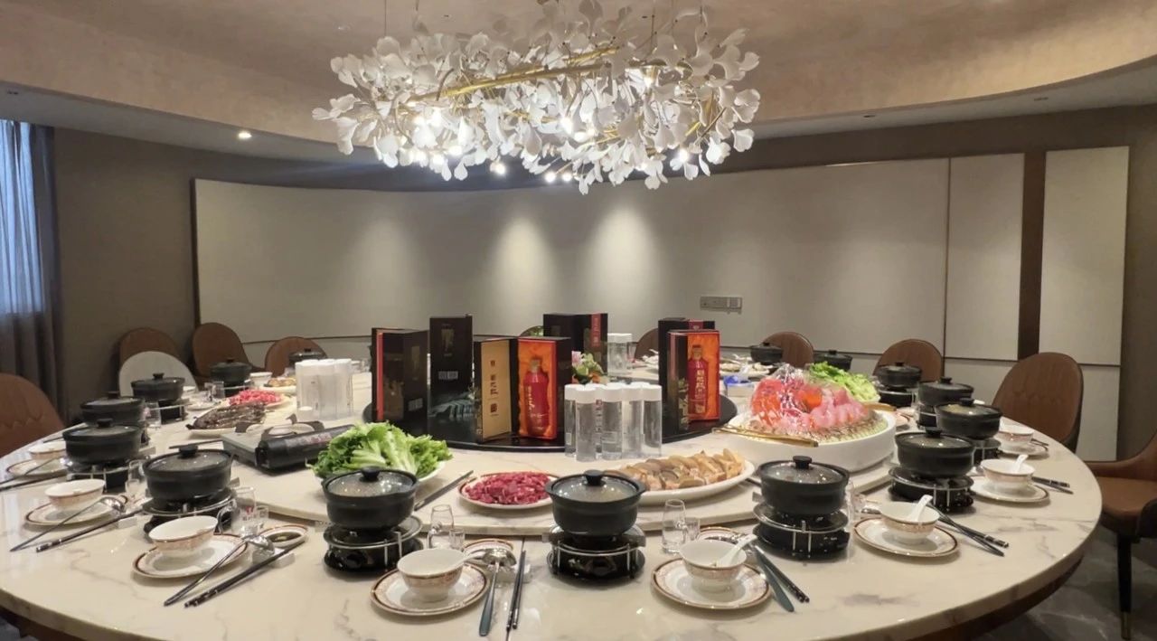 当夜幕缓缓降临,来宾们移步至蜀地红酒业总部的宴会厅,享受精心准备的美食与佳酿。为了表达对彭新智先生及王应奇会长的一直以来对蜀地红的大力支持,蜀地红酒业总经理何丽丽女士特别为他们准备了甲辰年(龙年)限量版白酒——蜀坔红作为礼物,以此向两位来宾致以诚挚的敬意。