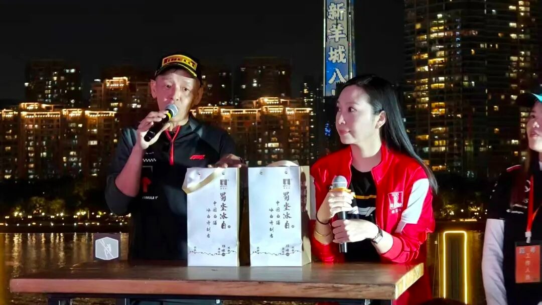 在正赛开始前,一场意义非凡的义卖活动悄然展开——为支援近期香港大埔火灾受灾群众,车迷会发起爱心募捐倡议,号召广大车迷与社会力量伸出援手。蜀地红酒业总经理何丽丽女士代表企业捐赠出旗下新品 “蜀坔冰白” 作为义卖拍品之一。