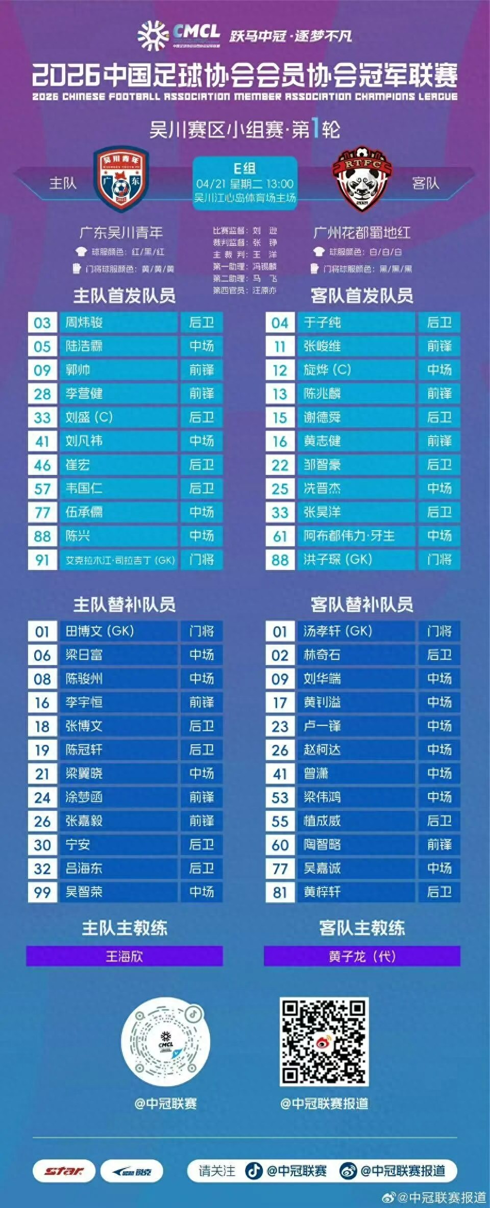 2026年4月21日,中冠联赛大区赛吴川赛区E组首轮的一场焦点战在吴川江心岛体育场主场地激情上演。客场作战的广州花都蜀地红队面对实力不俗且拥有主场之利的广东吴川青年队,展现出了极强的专业能力与韧性。经过90分钟的激烈鏖战,蜀地红队顶住压力,凭借下半场的关键进球,最终以1-1顽强逼平对手,在客场抢下宝贵一分!
